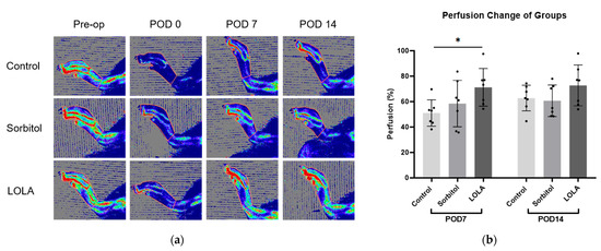 On POD seven, the group administered LOLA (group 3) exhibited a significantly higher perfusion recovery rate compared to the control (group 1) and sorbitol-administered group (group 2) (51.05 ± 10.31 vs. 58.45 ± 18.24 vs. 71.22 ± 14.79; p < 0.05). Although not statistically significant, there was a tendency towards increased perfusion recovery at POD 14 in group 3 compared to the other groups (group 1 vs. group 2 vs. group 3: 62.77 ± 10.10 vs. 60.67 ± 12.45 vs. 72.76 ± 16.09; p = 0.211) (Figure 2).