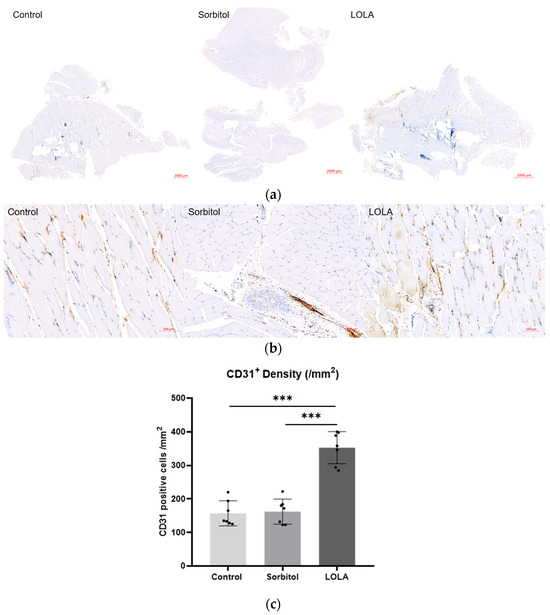 For a more in-depth examination of perfusion differences among the groups, muscle samples on POD 14 underwent immunohistochemistry targeting the endothelial cell marker CD31 to quantify vessel lumen density. The CD31-positive lumen density, indicative of capillary neovascularization, was significantly higher in rats treated with LOLA (group 3) compared to the other groups (157.14 ± 37.25 vs. 162.29 ± 37.53 vs. 352.86 ± 47.80; p < 0.001) (Figure 3).
