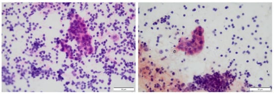 In Hashimoto thyroiditis (HT), the prevailing diagnostic antibodies are thyroid peroxidase antibodies (TPOAb) and thyroglobulin antibodies (TgAb), with the dominance of TPOAb, which occurs in up to 95% of patients [8,9,10]. Antibodies against thyroxine (T4), triiodothyronine (T3), pendrin (PDN), or sodium iodide symporter (NIS) can rarely be found in AIT [7,11]. Apparent hypothyroidism is defined as a high level of TSH and a low free thyroxine (fT4) level [10]. Laboratory hypothyroidism occurs with high TSH and normal fT4 and free triiodothyronine (fT3) levels [10]. Other diagnostic methods in approaching HT include ultrasonography (USG) of the thyroid gland and fine needle aspiration (FNA) [9,12]. The most commonly observed changes in the USG are enlargement, hypoechogenicity of the thyroid parenchyma, and hypervascularity, although it depends on the phase of HT [9,10,13]. Single or multiple nodules in the parenchyma of the thyroid may be present in the nodular type of HT [9]. Cytology findings performed by FNA most often present a lymphocytic thyroiditis with lymphoid follicles and metaplasia of oncocytic cells (Figure 1) [9,14].