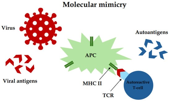 Molecular mimicry—a potential cause of autoimmunity due to the similarity between autoantigens and viral antigens. APC—antigen-presenting cell, MHC II—II class of major histocompatibility complex, TCR—T-cell receptor.