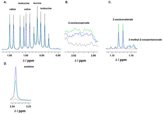 Representative 1H-NMR spectra of branched-chain amino acids (BCAAs), leucine, isoleucine, and valine (A); branched-chain keto acids (BCKAs), 2-oxoisocaproate (B), 2-oxoisovalerate, and 3-methyl-2-oxopentanonate (C), as well as of acetone (D). Spectra were recorded for culture media supplemented with 10% FBS before incubation (black line) or after 24 h incubation of astrocytes in media either with 5 mM glucose (green line) or 25 mM (blue line) initial glucose level. The ranges of chemical shifts (δ) for BCAA, BCKA, and acetone are depicted.