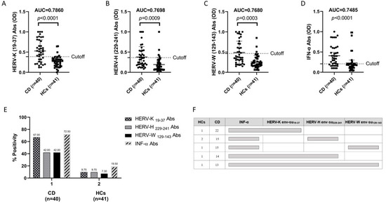 HERV-K env-su19-37 elicited the highest seroreactivity, accounting for 67% (n = 27) in the patients with CD and 10% (n = 4) in the HCs (AUC = 0.7860, CD versus HCs p < 0.0001; Figure 1A).