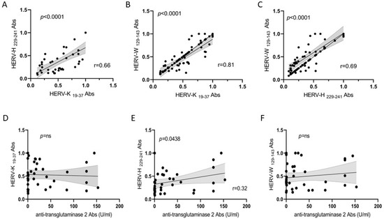 To define the possible associations among the antigenicity of the assessed peptides, we performed correlation analyses of the Abs positivity values in the patients with CD. The highest coefficient was obtained for HERV-K env-su peptide, followed by the HERV-H and HERV-W env-su peptides in pairwise plots, pointing to a possible synergic role of HERVs in patients with CD (Figure 2A–C, p < 0.0001). Also, we performed correlation analyses of the positivity values of Abs between the HERVs and the anti-TG2 Abs in the CD and HC groups (Figure 2D–F). No correlation was found between HERV-K env-su19–37, HERV-W env-su129-143, and anti-TG2 Abs (Figure 2D,F; p = ns). Although it was low, we found a correlation between HERV-H env-su229-241 and anti-TG2 Abs (Figure 2E; r = 0.32; p = 0.0438). However, the significance of this low correction needs to be further investigated.