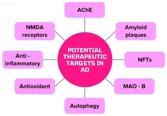 AD is a multifaceted disease with many hypotheses for the pathogenesis of the condition. One of them is oxidative stress. Excessive increases in ROS cause the initiation of apoptosis of nerve cells in the brain. In addition, aging and neuroinflammation further seeded the formation of oxidative stress. Another hypothesis is the stimulation of cholinergic neurotransmission in the brain by inhibiting the enzyme pathway [4]. Moreover, pathological processing of Aβ and tau protein is found. In addition, neurovascular changes and synaptic and mitochondrial dysfunctions also contribute to the potential onset and worsening of AD. Additionally, 5% of AD patients have a familial form of the disease. They are found to have mutations in the presenilin 1 (PSEN1), presenilin 2 (PSEN2), or the Amyloid precursor protein (APP) genes [5]. A number of disease mechanisms expand the potential points of entry for substances used in AD therapy [4].
