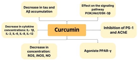 The role of oxidative stress in AD pathology has been increasingly mentioned. It is stated that curcumin is categorized as a peroxisome proliferator-activated receptor γ (PPARγ) agonist, resulting in improved mitochondrial function and reduced ROS formation. In addition, it has been noted that the compound has the effect of inhibiting the activation of microglia by lipopolysaccharides, thus reducing the production of nitric oxide (NO) and the pro-inflammatory cytokines IL-6 and IL-1β [69]. Curcumin is responsible for inhibiting lipid peroxidation, by which amyloid accumulation and oxidative stress-induced neurotoxicity are reduced [70].