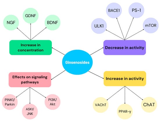 Ginseng is an herb whose neuroprotective effects are mainly based on counteracting AD pathomechanism cascades, Aβ formation, anti-apoptosis, anti-inflammatory effects and mitochondrial dysfunction [78]. Ginsenosides are among the most promising substances found in Ginseng [36].