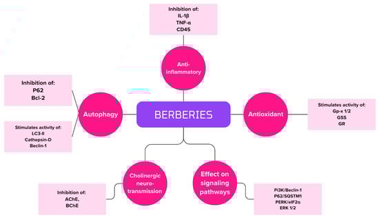 The anti-inflammatory properties of berberine were also investigated. The researchers used astrocyte AND microglia biomarkers to detect anti-inflammatory properties. Anti-GFAP (glial fibrillary acidic protein) was used to assess the number of biomarkers in astrocytes, while anti-CD 45 was used for glial. In addition, inflammatory markers were measured: IL-1β: interleukin 1 beta; TNF-α: tumor necrosis factor alpha. The results shown in Table 5 indicate that berberine has anti-inflammatory and antioxidant properties. It decreases the concentration of CD45, GFAP, TNF-α and IL-1β. At the same time, it increases the content of GPx-1/2, GSS or GR. These results indicate that the substance has potential applications in the treatment of Alzheimer’s disease [102].