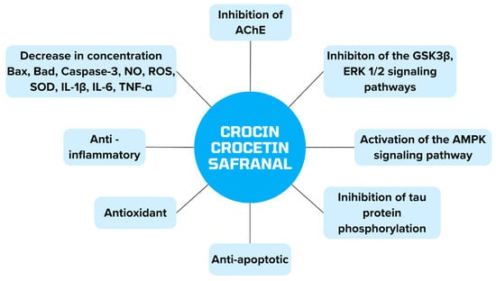 Saffron has many pharmacological properties: analgesic, anti-inflammatory, hepatoprotective, sleep-inducing, antioxidant, antimicrobial, antidiabetic, antinausea, antidepressant, antispasmodic, antianxiety, anticonvulsant, antitussive and neuroprotective [51,52,53].