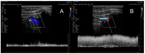 Ultrasound examination of the subclavian vein in resting position (A) and in abduction to 90 degrees (B), with a high increase in flow near occlusion.