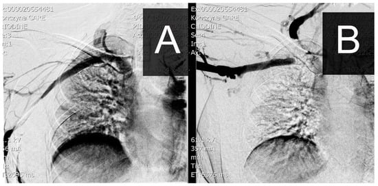 Image of a venographic examination at rest (A) and with the limb abducted to 90 degrees (B) with occlusion at the level of the clavicle/1st rib.