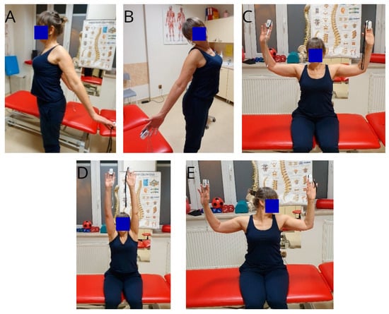The following TOS provocation tests were performed as part of a clinical study. Subjects were evaluated in a standing or sitting position (see Figure 4A–E). Bilateral pulse rate measurements were taken with pulse oximeters placed on the index fingers of both hands to more precisely assess the pulse wave []. Several provocation tests were used due to their relatively low sensitivity and specificity [,].