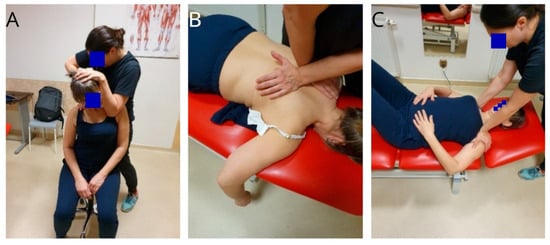 The physiotherapy intervention consisted of 10 physiotherapy sessions lasting 30 to 45 min, conducted at weekly intervals between November 2023 and January 2024. During the appointment, physical therapy was performed, including manual therapy techniques of mobilisation of the first rib; mobilisation of the upper and middle thoracic region of the intercostal joints and the rib joints; mobilisation of the cervical region; stretching of the pectoralis minor muscle, the anterior scalene muscle, and the middle scalene muscle; dynamic stabilisation exercises for the scapula []; corrective Kinesio-taping for alignment of the scapula with respect to the thorax; and soft tissue therapy for the upper quadrant of the body, for example, the subclavius muscle, m. pectoralis minor, m. scalenus anterior, scalenus medius, m. levator scapulae, and m trapezius (Figure 5A–C) [,].