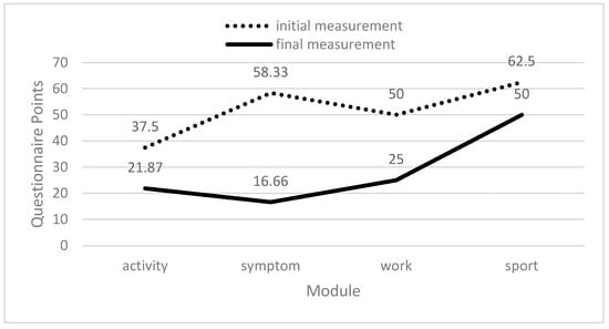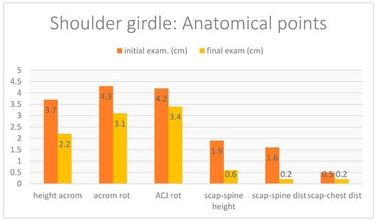 The difference between the height of the acromion process after the intervention was 1.5 cm, which was the highest value of the disproportional reduction achieved. The post-thrombotic side is always placed lower. Then, for rotation at the level of the acromion processes and the acromioclavicular joints, a reduction of 1.2 cm and 0.8 cm, respectively, was obtained. The right side of the body was positioned forward in front of the left side in the transverse plane. When assessing the position of the scapula, the greatest reduction in disproportion was achieved for the difference between the distance between the right and left sides of the spine, which was 1.4 cm. The right scapula was positioned further away from the spine. Taking into account the difference between the scapula’s right and left sides in the height in the frontal plane, a reduction of 1.3 cm was obtained, where the involved side was placed lower. The last parameter was the difference between the sides in the separation of the lower angle from the thorax, which was 0.3 cm. The lower angle on the involved side was more prominent. Baseline and post-intervention measurement data are summarised in Figure 9. It should be noted that abnormalities occur in the position of the scapula in all planes of motion, so the decision was made to implement dynamic stabilisation exercises for the scapula.
