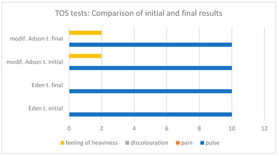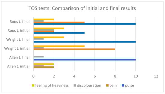 When comparing the period before the intervention with the period after the intervention, improvement was achieved in individual parameters diagnosed with various tests. Pulse palpability increased significantly in the Allen, Wright, and Roos’ tests. In turn, the sensation of pain was eliminated in all provocative tests, except the Roos test, where an increase in pain was reported. The discolouration was only reduced in the Roos test, but the initial level of discomfort was low. The feeling of heaviness was rated as lower in the Allen, Wright, and Roos tests. The results of the tests performed before and after physical therapy are shown in Figure 7 and Figure 8, respectively.