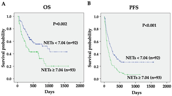 Association between pretreatment NET levels and OS or PFS. Kaplan–Meier plot of OS (A) or PFS (B) in the high- and low-NET groups. The ICI-treated patients were divided into two groups based on the median value of NETs (7.04 ng/mL). Differences were assessed statistically using the log-rank test. The high-NET group showed significantly worse OS (p = 0.002) and PFS (p < 0.001) than the low-NET group.