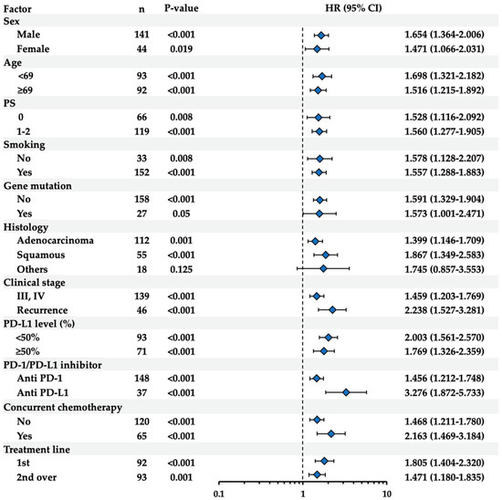 The clinical significance of pretreatment NET levels was further examined in subgroups stratified by other clinical factors, including sex, age, PS, smoking history, driver gene mutation, histology, clinical stage, PD-L1 expression levels in tumor tissues, ICI type, concurrent chemotherapy, and treatment line. As shown in Figure 2, the pretreatment NET levels were significantly associated with OS in the subgroups examined, except for “others” histology. Similarly, the pretreatment NET levels were also significantly associated with PFS in the subgroups examined, except for females, those with no smoking history, and positive driver gene mutation (Figure 3). Kaplan–Meier survival curves were constructed to study the impact of pretreatment NET levels on OS or PFS in the subgroups based on histopathological types or smoking history. As shown in Figure S2, significant differences were observed between the high- and low-NET groups in the adenocarcinoma (OS: p = 0.045; PFS: p = 0.008) and squamous cell carcinoma subgroups (OS: p = 0.008; PFS: p = 0.025), but not in the “others” subgroup (OS: p = 0.602; PFS: p = 0.117). Additionally, as shown in Figure S3, significant differences were observed between the high- and low-NET groups in the subgroup with smoking history (OS: p = 0.021; PFS: p < 0.001). In contrast, in the subgroup without a smoking history, the high-NET group was significantly different from the low-NET group in OS (p = 0.018) but not in PFS (p = 0.353). It may be possible that the small number of patients in the subgroups of females (n = 44), those with no smoking history (n = 33), positive driver gene mutation (n = 27), and “others” histology (n = 18) affected the statistical evaluation in PFS.