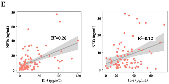 The relationships between the pretreatment NET levels and other soluble immune mediators in plasma were also examined in 98 patients whose plasma samples were available for this analysis. The levels of soluble immune mediators in plasma before ICI treatment were assessed for correlations with the NET levels by Spearman’s rank correlation coefficient analysis. As shown in Figure 4D, significant correlations (rs > 0.3, FDR < 0.05) were observed for 11 soluble immune mediators, including IL-6 (rs = 0.531), LIGHT (rs = 0.478), IL-2Ra (rs = 0.394), IL-8 (rs = 0.357), pentraxin-3 (rs = 0.348), IL-11 (rs = 0.342), IL-16 (rs = 0.325), IL-10 (rs = 0.307), TSLP (rs = 0.307), IFNγ (rs = 0.301), and CXCL2 (rs = 0.301). Of note, IL-6 and IL-8, which were reported to be associated with NET formation [20,21,22,23,24,25], showed high linear correlations with the NET levels (Figure 4E). Additionally, plasma IL-6 and IL-8 concentrations showed significantly negative or positive correlations with many NET-related genes (Figure 4B). Of note, plasma IL-8 concentration showed a significantly positive correlation with IL-8 mRNA level in PBMCs (Figure 4B), suggesting that plasma IL-8 may be at least partly derived from immune cells in the peripheral blood. In contrast, plasma IL-6 concentration showed no significant correlation with IL-6 mRNA level in PBMCs (Figure 4B). This result suggested that the production of plasma IL-6 may not be derived from immune cells in the peripheral blood but possibly from other cells or tissues within tumors.