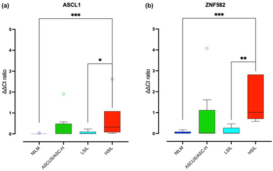 In addition, there were statistically significant differences in the ddCt ratio as follows: (1) ASCL1 gene in HSIL vs. NILM (p = 0.0007) and HSIL vs. LSIL (p = 0.026); (2) ZNF582 gene in HSIL vs. NILM (p = 0.001) and HSIL vs. LSIL (p = 0.0043).