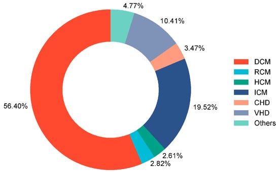Underlying diagnosis of heart failure resulting in HT among enrolled patients. DCM: dilated cardiomyopathy; RCM: restrictive cardiomyopathy; HCM: hypertrophic cardiomyopathy; ICM: ischemic cardiomyopathy; CHD: congenital heart disease; VHD: valvular heart disease; HT: heart transplantation.
