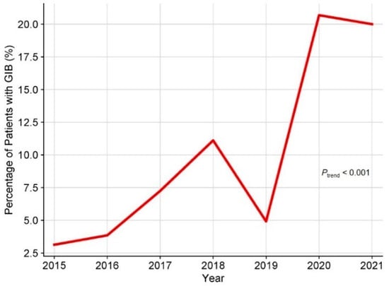 Over the last 50 years, HT has undergone significant advancements in improving the survival of patients with advanced heart failure. Nonetheless, the persistence of postoperative complications poses a formidable challenge to clinical management, as they are frequently associated with adverse clinical outcomes []. It is reported that GIB following cardiac surgery is a relatively rare entity but carries a pronounced mortality risk [,]. For instance, a cohort study involving 2956 patients who underwent cardiac surgery (e.g., aortocoronary bypass grafting, valve replacement, aortic aneurysm) revealed the postoperative incidence of GIB to be 0.9%, with an in-hospital mortality rate of 35% []. Another study based on three prospectively maintained databases of 9017 cardiac surgery patients (coronary artery bypass grafting and valve procedures) reported an overall incidence of postoperative GIB of 1.01%, with duodenal ulceration identified as the predominant bleeding source, constituting 78% of cases []. These GIB patients had prolonged postoperative hospital stays and a heightened 30-day mortality rate (8.8%) compared to the control group []. However, despite the high risk of bleeding complications among HT recipients [], the currently available research lacks a comprehensive investigation into the postoperative GIB in this cohort. In our study, we retrospectively analyzed a cohort of 461 HT patients and found that 8.7% experienced postoperative GIB, with the incidence increasing from 3.1% in 2015 to 20.0% in 2021.