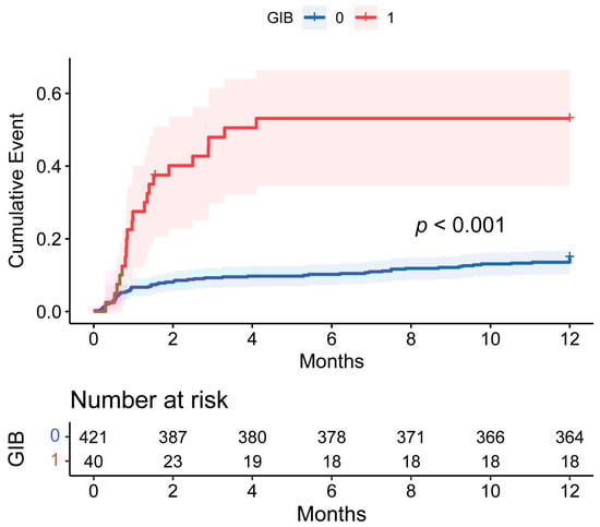 Cumulative incidence of events comparing 1-year mortality between patients with and without postoperative GIB after HT. The shaded area around the curves represents the 95% CI. GIB: gastrointestinal bleeding; HT: heart transplantation; CI: confidence interval.