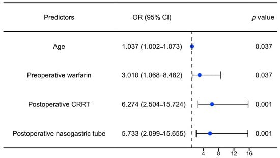 To further explore the independent factors associated with GIB after HT, univariate and multivariate logistic regression analyses were performed. According to the results of the univariate analysis, variables with a p value of <0.1 and clinical significance were selected for the multivariate regression analysis. After adjusting for a series of variables (e.g., male, cross-clamp time, operation time), age (OR: 1.04, 95% CI: 1.00–1.07, p: 0.037), preoperative warfarin (OR: 3.01, 95% CI: 1.07–8.48, p: 0.037), postoperative CRRT (OR: 6.27, 95% CI: 2.50–15.72, p < 0.001), and postoperative nasogastric tube (OR: 5.73, 95% CI: 2.10–15.66, p: 0.001) were significantly associated with postoperative GIB in the patients with HT, as illustrated in Figure 5 and Table 2.