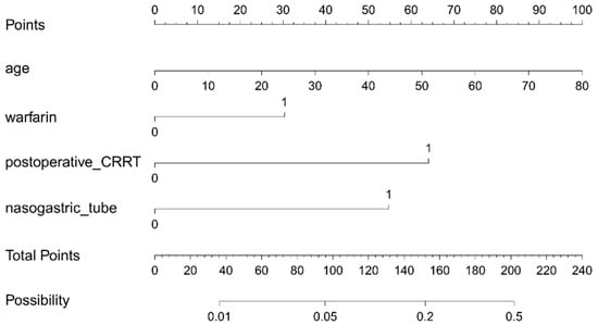 Notably, several intraoperative indicators, including CPB time, cross-clamp time, and operation time, have been reported as risk factors for gastrointestinal complications []. However, evidence of their association with postoperative GIB in HT patients remains inconclusive. Previous studies have suggested that prolonged CPB and aortic cross-clamp times may exert adverse effects on abdominal perfusion and splanchnic perfusion during CPB procedures, leading to inadequate metabolic supply and exacerbating gastrointestinal complications [,]. However, most of the evidence primarily focuses on intestinal ischemic injury rather than specifically on GIB. In our study, the univariate analyses revealed that the CPB time, aortic cross-clamp time, and operation time were significant, but after adjusting for other clinical variables, their significance diminished, suggesting that these intraoperative variables may not independently predispose individuals to GIB.