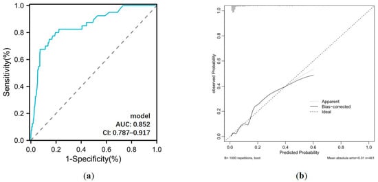 Based on the results of the multivariate analysis, a nomogram model containing four independent variables was constructed to predict the occurrence of GIB after HT (Figure 6). The prediction model visually emphasized age as the most critical predictor. The probability of postoperative GIB was determined based on the value at a vertical line from the corresponding total points, which was the sum of the relative scores for each parameter. In addition, the predictive accuracy of this model was evaluated based on the ROC curve and the calibration curve. As shown in Figure 7, the area under the curve (AUC) was 0.852 (95% CI: 0.787–0.917, p < 0.001), with a sensitivity of 80.0% and specificity of 80.5%, and the calibration curve closely aligned with the ideal diagonal line.