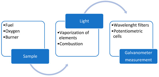 First used for this purpose in 1946, this method was one of the first used to determine concentrations of sodium, potassium, and even lithium in samples of blood and urine [20]. In this technique, the solution under analysis is placed into a chamber and is directed towards the flame [20]. The light produced by the vaporization of elements (which combusts) is conducted through filters to a potentiometric cell, which activates a galvanometer. Ion concentrations are then estimated from the galvanometer reading [20]. This procedure is succinctly outlined in Figure 1.