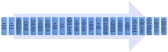 With the results obtained in this review, it is possible to assume that there was a growing concern with precision and specificity values over time, especially when the use of titration methods emerged and interferents on other assays were attenuated with new studies and new protocols. Methods showing undesirable accuracy results concerning clinical analysis, like flame emission spectrophotometry or fluorometry, are not currently used in hospital laboratories, although they can be used in an investigation context. In addition, there was a growing interest in obtaining faster results, with the advancement of medicine and hospital diagnostics. It was possible to observe that an ion analysis went from many hours to a few minutes in about two decades, which may have reflected the needs of new organizations in health systems. Methods that are very time consuming, like gravimetry or chromatography with or without electrophoresis or enzymatic colorimetric assays, or present many interferants with biological samples, like titration without the complement of potentiometry and plasma emission spectrometry, are also not much used in clinical contexts, as they would need to be improved. In Figure 3, there is a chronological scheme that reflects the appearance of the different quantitative methodologies addressed over time.
