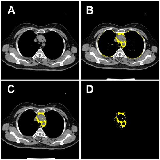 Process of extracting the mediastinal fat mask from computed tomography (CT) images. (A) Shows the original CT slice. (B) Represents the total intrathoracic fat tissue with Hounsfield Units (HU) threshold ranging from −200 to −40. (C) Represents the drawn region of interest for intrathoracic mediastinal fat. (D) Shows the mediastinal fat mask extracted from the CT image based on the mediastinal fat region. Initially, as shown in (A), the CT image is prepared at the level of the aortic arch. Then, as illustrated in (B), Image J is utilized to set a Hounsfield Unit (HU) threshold ranging from −200 to −40 in the CT image, which results in the delineation of the yellow region, encompassing all intrathoracic fat. Subsequently, as depicted in (C), the mediastinal fat region is manually delineated. Finally, the mediastinal fat mask is generated as shown in (D).