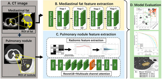 The following supporting information can be downloaded at https://www.mdpi.com/article/10.3390/biomedicines12081865/s1, Supplementary File S1: Patient recruitment; Supplementary File S2: CT image acquisition; Supplementary File S3: Imaging data processing; Supplementary File S4: Radiomic feature extraction; Supplementary File S5: Deep learning feature extraction; Supplementary File S6: Evaluation of model performance; Supplementary File S7: Method of feature selection; Supplementary File S8: Stratified analysis of nomogram; Figure S1: The detailed process of extracting mediastinal fat mask from CT images; Figure S2: Network architecture of multi-scale channel attention mechanism; Figure S3: Network architecture of Swin transformer model; Figure S4: Pulmonary nodule texture features and mediastinal fat features selection using the least absolute shrinkage and selection operator (LASSO) logistic regression model; Figure S5: The clinical impact plot and the ROC component plot; Figure S6: Model 3 score for each subgroup; Table S1: The CT image acquisition parameters of the three centers; Table S2: Machine learning model selection for nomogram score building.