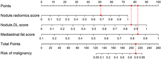 Additionally, we demonstrated how to use the nomogram with an example shown in Figure 4, involving a true-positive case of a 63-year-old male patient. Initially, the scores for the Nodule.radiomics.score, Nodule.DL.score, and Mediastinal.fat.score are 0.693, 0.857, and 0.845, respectively. These scores correspond to point values of 51.012, 76.133, and 82.581 on the Total Points scale line. After that, summing these points gives a total of 209.726, which is located on the Total Points scale line. Finally, aligning this value with the Risk of Malignancy scale line determines the patient’s probability of malignancy.