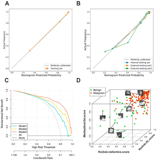 Clinical benefit evaluation of Model 3. (A) Calibration curves of Model 3 nomograms in the training set and (B) other sets; the calibration curve revealed a good predictive accuracy between the actual probability and predicted probability. (C) The predicted malignant probability is plotted on the X-axis and the observed malignant probability is plotted on the Y-axis. Decision curves for Model 1, Model 2, and Model 3. The X-axis and the bottom line display the risk threshold and the net benefit–cost ratio. The Y-axis shows the normalized net benefit for a wide range; the decision curves indicated that Model 3 could provide greater benefits to patients compared to Model 1, Model 2, “none” or “all” scheme. (D) The 3D visualization and scatter plot of the pulmonary nodule benign–malignant classification is displayed using scatterplot3d (version 0.3-41). Malignant nodules are highlighted in red and cluster in the upper right corner, while benign nodules are highlighted in green and are relatively scattered. Model 1—radiomics model that includes only nodule region features; Model 2—deep learning radiomics model that includes only nodule region features; Model 3—model that combines nodule region and mediastinal fat features.