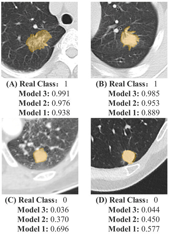 Examples of predictions using Model 1, Model 2, and Model 3. (A,B) represent a benign sample and (C,D) represent a malignant sample. The yellow region represents the nodule area. The models provide the predicted probability of malignant nodules. The real class, 0, represents benign nodules, and 1 represents malignant nodules. Model 1—radiomics model that includes only nodule region features; Model 2—deep learning radiomics model that includes only nodule region features; Model 3—model that combines nodule region and mediastinal fat features.