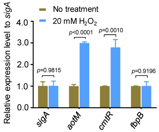 The expression of aotM gene is induced by H2O2 stress. RT-qPCR was performed to detect the expression of aotM in wild-type M. bovis BCG strains treated with 20 mM H2O2. The relative gene expression levels were normalized using the sigA gene as the internal reference. cmtR and fbpB were used as the positive control and the negative control, respectively. Error bars represent the standard deviation of the three biological replicates. A two-tailed unpaired Student’s t-test was used for statistical analysis using GraphPad Prism 8. p-values are indicated.