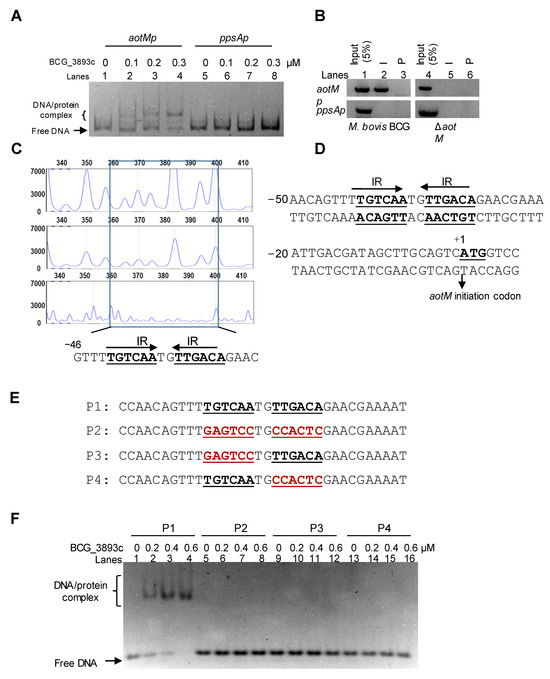 Analyses of the AotM binding motif. (A) EMSA assay for the DNA binding activity of AotM. The mixtures were electrophoresed in a 5% native polyacrylamide gel. The 100 ng aotM promoter (aotMp, 500 bp, lanes 1–4) and 100 ng negative control gene promoter (ppsAp, 500 bp, lanes 5–8) were incubated with different concentrations (0–0.3 µM) of AotM protein. (B) ChIP assays. The pre-immune (P) serum and the post-immune (I) serum were used in the ChIP. An mycobacterial promoter ppsAp was used as a negative control. (C) The DNase I footprinting assay. The protection of the aotM promoter DNA against DNaseI digestion by increasing amounts of AotM was evaluated. The sequences of the protected regions on the non-coding strand are marked in the box in the figures. (D) Sequence and structural characteristics of the promoter region protected by AotM. The regions protected by AotM are indicated with underlines; the translation start codon of AotM is indicated in bold. (E) The DNA binding motif with the designed IR mutated regions. The mutated regions are indicated in red. (F) EMSA of the short DNA substrates (34 bp), with or without the IR sequence. The mixtures were electrophoresed in a 5% native polyacrylamide gel. Each DNA substrate was co-incubated with 0–0.6 µM AotM protein.