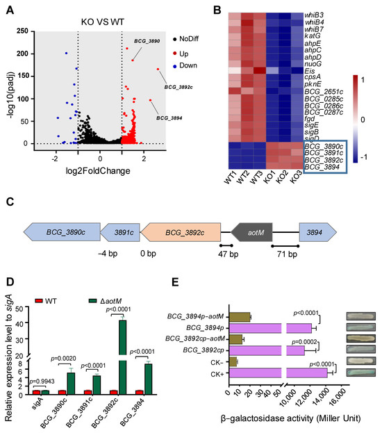 AotM regulates the expression of the adjacent genes. (A) The transcriptome difference between the wild-type M. bovis BCG and the aotM deletion mutant determined by RNA-seq was shown in the volcanic diagram. The significantly up-regulated- and the significantly downregulated genes were shown by red and blue spots, respectively. Genes that were not significantly changed were shown by black spots. (B) Heat map of the AotM-regulated differential expression profile for the antioxidant genes and adjacent genes. WT1, WT2, and WT3 represent separately three biological replicates of the genes in the wild-type strain. KO1, KO2, and KO3 represent separately three biological replicates of differentially expressed genes in the aotM knockout strain. Adjacent genes of aotM are indicated in the blue boxes. (C) Localization of the aotM on the genome in M. bovis BCG. The number at the bottom represents the number of separated bases between adjacent genes. (D) RT-qPCR was performed to detect the expression of the target gene in the ΔaotM deletion mutant and wild-type control strains. The relative gene expression levels were normalized using the sigA gene as an internal reference. The error bars represent the standard deviation of three biological replicates. A two-tailed unpaired Student’s t-test was used for statistical analysis using GraphPad Prism 8. P-values are indicated. (E) β-galactosidase activity assay. Schematic diagram of plasmids containing promoter-lacZ and promoter-aotM-lacZ, no promoter as negative control (CK−) and hsp60 promoter as a positive control (CK+). All the plasmids were transformed into the Escherichia coli. The activity of β-galactosidase is expressed as Miller units. Data are expressed as the mean ± standard deviations of three independent replicates.