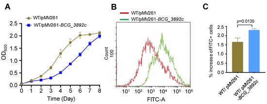 AotM strongly inhibits the expression of bcg_3892c gene (Figure 4D,E). Then, we were curious about the effects of the dysfunctional expression of bcg_3892c. To test this, we overexpressed bcg_3892c in the WT BCG strain using the replicative vector pMV261. An approximately 22-fold upregulation of the transcription level of bcg_3892c was confirmed in the overexpression strain by the RT-qPCR experiment (Figure S3). Interestingly, overexpression of bcg_3892c partially inhibited the growth of M. bovis (Figure 6A). The bcg_3892c gene encodes a putative FAD-dependent oxidoreductase. Oxidation processes could usually affect intracellular ROS levels [37,38]. To test whether the intracellular ROS levels were changed, we performed a dichloro-dihydro-fluorescein diacetate (DCFH-DA) assay, which is widely used in the detection of reactive oxygen species (ROS) [36]. The fluorescent probe DCFH-DA was incubated with the active bacterial cells, and then the intracellular ROS levels were indicated by the intensity of the fluorescent signal (FITC-A). Interestingly, we found that the fluorescence signal was increased by 41% in the BCG_3892c overexpression strain compared to the control strain with the same bacterial population (Figure 6B,C), suggesting that overexpression of BCG_3892c increases the intracellular ROS production. In conclusion, these results suggest that overexpression of BCG_3892c could reduce the growth of M. bovis, probably due to the increased intracellular ROS production.