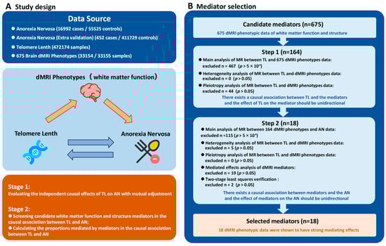This study employed a bidirectional and two-step approach to investigate the potential causal relationship between TL and AN and to assess the mediating effect of white matter phenotypes in this causal pathway. The first step involved MR analysis based on genetic variants to explore the causal relationships between TL and AN, TL and white matter phenotypes, and white matter phenotypes and AN. The second step evaluated the mediating effect of white matter phenotypes in these relationships and quantified their proportion using the coefficient product method, thus revealing the potential significance of white matter phenotypes in the influence of TL on AN.