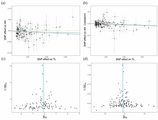Scatter plots and funnel plots of direct Mendelian randomization (MR) analysis. (a) Scatter plot of causal relationship between telomere length (TL) and test group of anorexia nervosa (AN). (b) Scatter plot of causal relationship between TL and validation group of AN. (c) Funnel plot of causal relationship between TL and test group of AN. (d) Funnel plot of causal relationship between TL and validation group of AN.