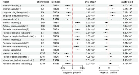 Step 1: Relationship between TL and dMRI Phenotypes. In the first part of the second stage, we verified the random relationship between TL and dMRI phenotypes. We found heterogeneity among GWAS with significant correlations; however, 44 dMRI phenotypes GWAS showed horizontal pleiotropy with TL (p < 0.05). To maintain the robustness of the final results, we excluded these GWAS before proceeding to the next MR step.