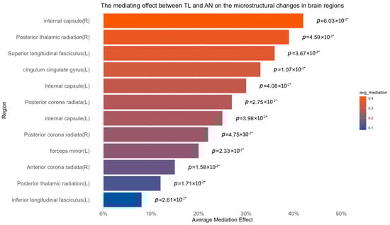 We examined the mediation effects of different mediators to validate the brain regions potentially mediating the TL–AN association. After the sensitivity analysis, we included 44 dMRI phenotypes GWAS results for a final mediation effect validation. Using the two-step MR results, we calculated the mediation effect values and significance, which are detailed in Table S12. After screening and excluding associations with non-significant mediation effects (p > 0.05), we obtained 18 strongly significant final results, which were all from the main dataset (Table 2, Figure 4). These findings highlight the specific brain regions where changes in the white matter microstructure mediate the relationship between TL and AN, providing critical insights into the neural mechanisms underlying the genetic influence of TL on the risk of developing AN.