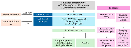 Proposed Randomized Clinical Trial protocol for heart failure prevention in long-term survivors of childhood cancer. ATC: anthracyclines; CMR: cardiac magnetic resonance; GLS: global longitudinal strain; HFrEF: heart failure with reduced ejection fraction; LVEF: left ventricular ejection fraction; LVSD: left ventricular systolic dysfunction; RT: radiotherapy; TTE: transthoracic echocardiography.