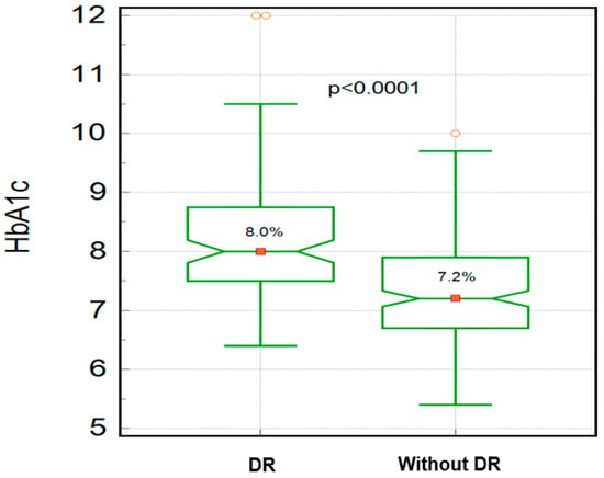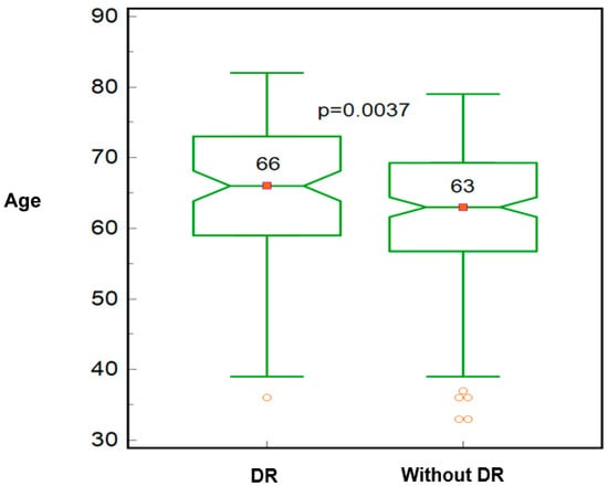 The presence of DR was associated with a significantly higher diabetes duration (15 vs. 12 years; p = 0.0076; Mann–Whitney test), HbA1c (8.0 vs. 7.2 percentage points; p < 0.0001; Figure 3), BMI (28.3 vs. 27 kg/m; p = 0.0064) and age (66 vs. 63 years; p = 0.037; Figure 4). No significant association was found between DR and IOP values, as illustrated in Table 4.