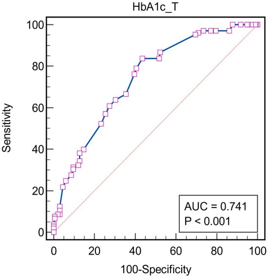 To evaluate the prediction performance of HbA1c in the development of DR, ROC analysis was performed. The results pointed out that HbA1c value is a valid predictor for the development of DR (AUROC = 0.741; p = 0.001), having the best prediction threshold, according to the Youden’s method at a HbA1c value higher than 7.2%, corresponding to a sensitivity of 83.81% and associated specificity of 56.35% (Figure 5).