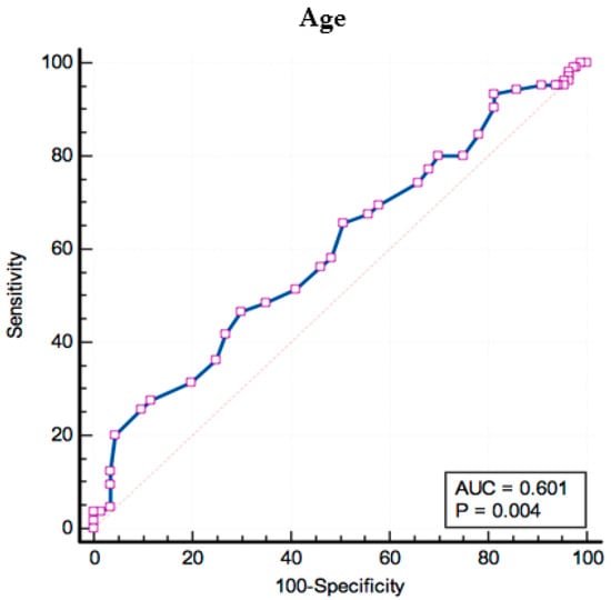 Another valid predictor for the development of DR in patients with Type 2 DM was patient’s age, with a threshold of > 67 years, corresponding to a sensitivity of 46.47% and specificity of 70.05% (AUROC = 0.601; p = 0.004; Figure 6).