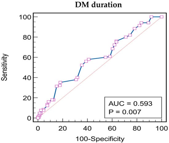 Regarding DM duration, as stated by the ROC curve parameters (AUROC = 0.593, p = 0.007), DM duration over 13 years was associated with a sensitivity of 56.19% and specificity of 60.91% (Figure 7).