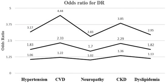 Most T2DM patients, including the population of this study, exhibit a various number of comorbidities that significantly impact their quality of life by also subsequently increasing their potential risk of developing DR. As shown in Table 7, the presence of other diabetes complications or comorbidities (hypertension, CVD, CKD and dyslipidaemia) were associated with a higher risk of DR occurrence (Figure 8), while no significant differences were found regarding polyneuropathy or smoking.