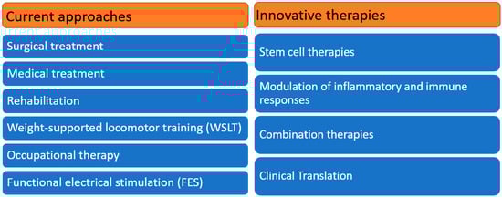 The management of TBI and SCI poses complex challenges necessitating a comprehensive therapeutic approach (Figure 1). Historically, conventional treatments have focused on immediate stabilization, surgical interventions, and supportive medical care to address both the initial and secondary damage associated with CNS injuries [,]. These traditional strategies are fundamental to patient recovery and encompass decompressive surgeries, intracranial pressure monitoring, and extensive rehabilitation programs aimed at restoring function and improving quality of life []. In recent years, the emergence of innovative therapies has brought new hope and expanded treatment options []. Breakthroughs in stem cell therapy, gene editing, and neuroprosthetics are transforming treatment strategies, offering prospects not only for recovery but also for the regeneration of damaged neural tissues [,,]. Integrating these novel approaches with traditional methods holds promise for enhancing outcomes and reshaping recovery pathways for patients with these challenging conditions []. Therefore, an interdisciplinary approach is crucial for the effective management of CNS trauma, combining state-of-the-art technology with established medical practices to achieve optimal results [].